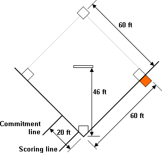- A "commitment line" will be drawn perpendicular to the third baseline, 20 feet from the point of home plate. (See the diagram below.) Once a player touches the commitment line or the ground past the commitment line, she cannot go back to third base except on a foul ball that is not caught.